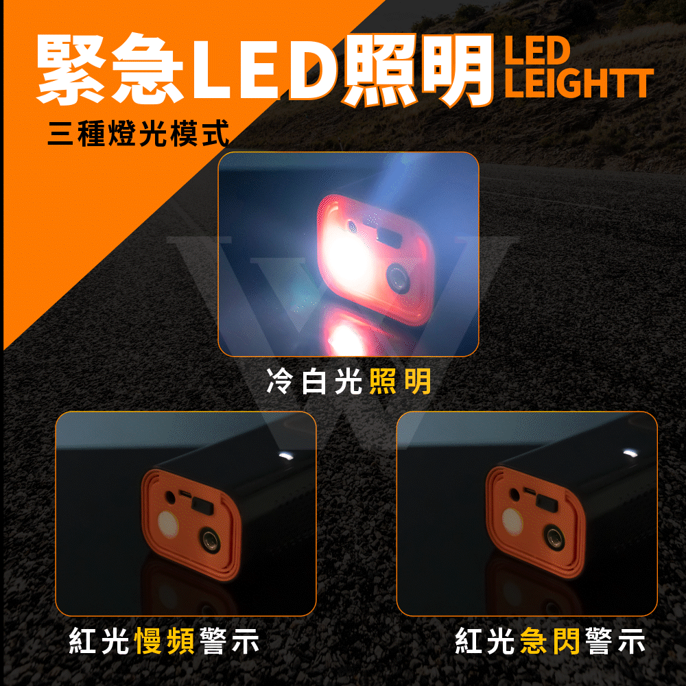 •三種LED燈光模式(白光照明、紅光慢頻警示、紅藍光危險警示)