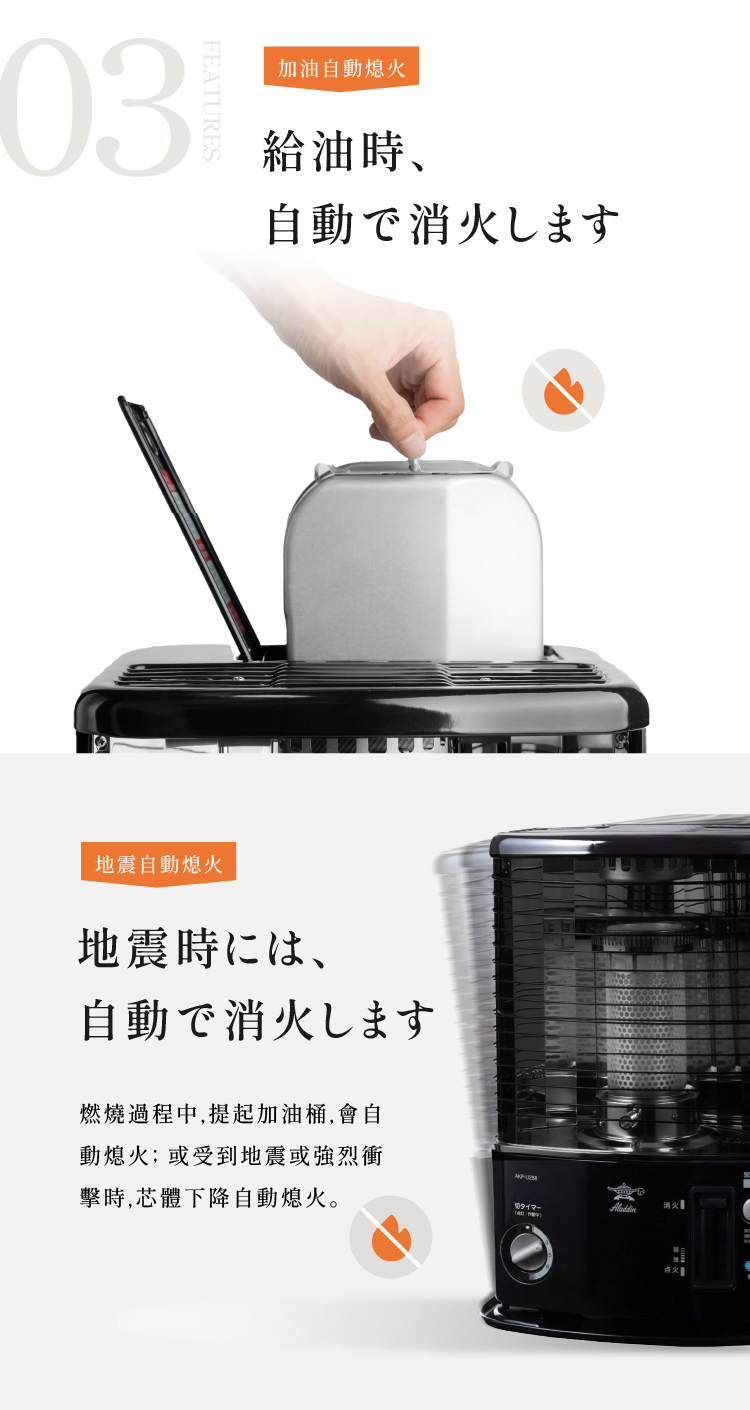 安全裝置:加油時候自動滅火裝置、防震自動滅火裝置
