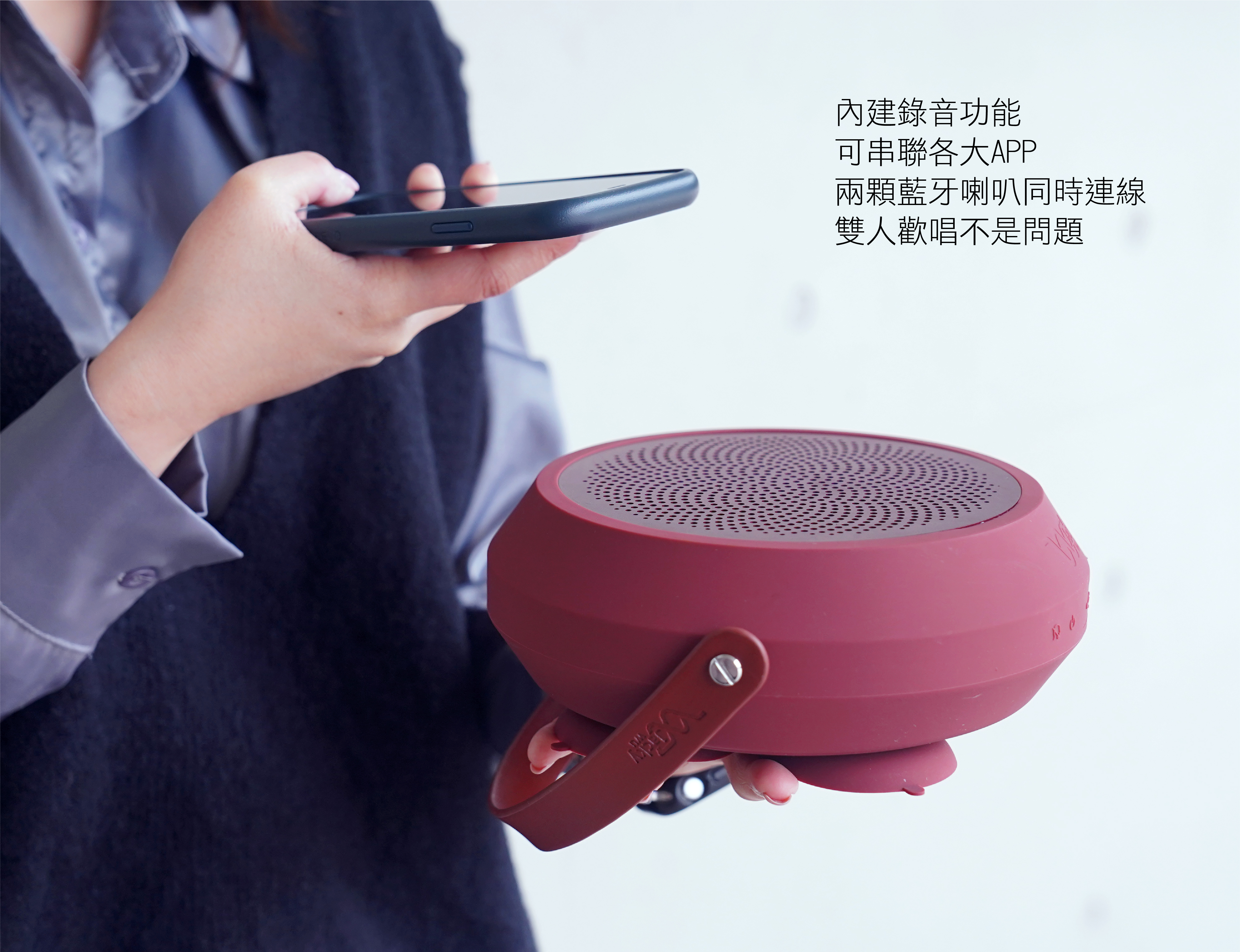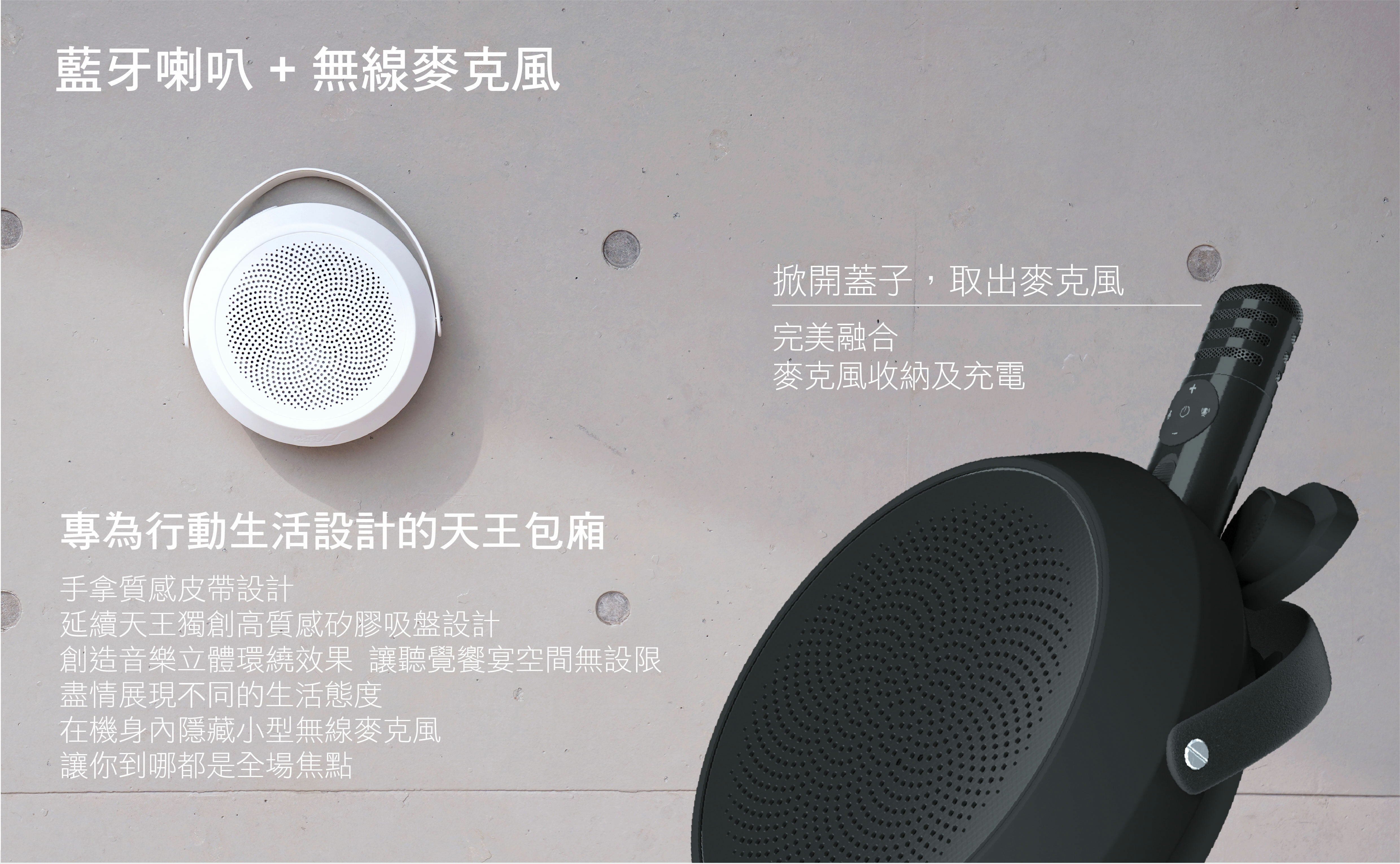 戶外防水麥克風藍牙K歌喇叭,質感皮帶提把可方便攜帶,整個機身採用高檔矽膠與鋁合金材質打造。