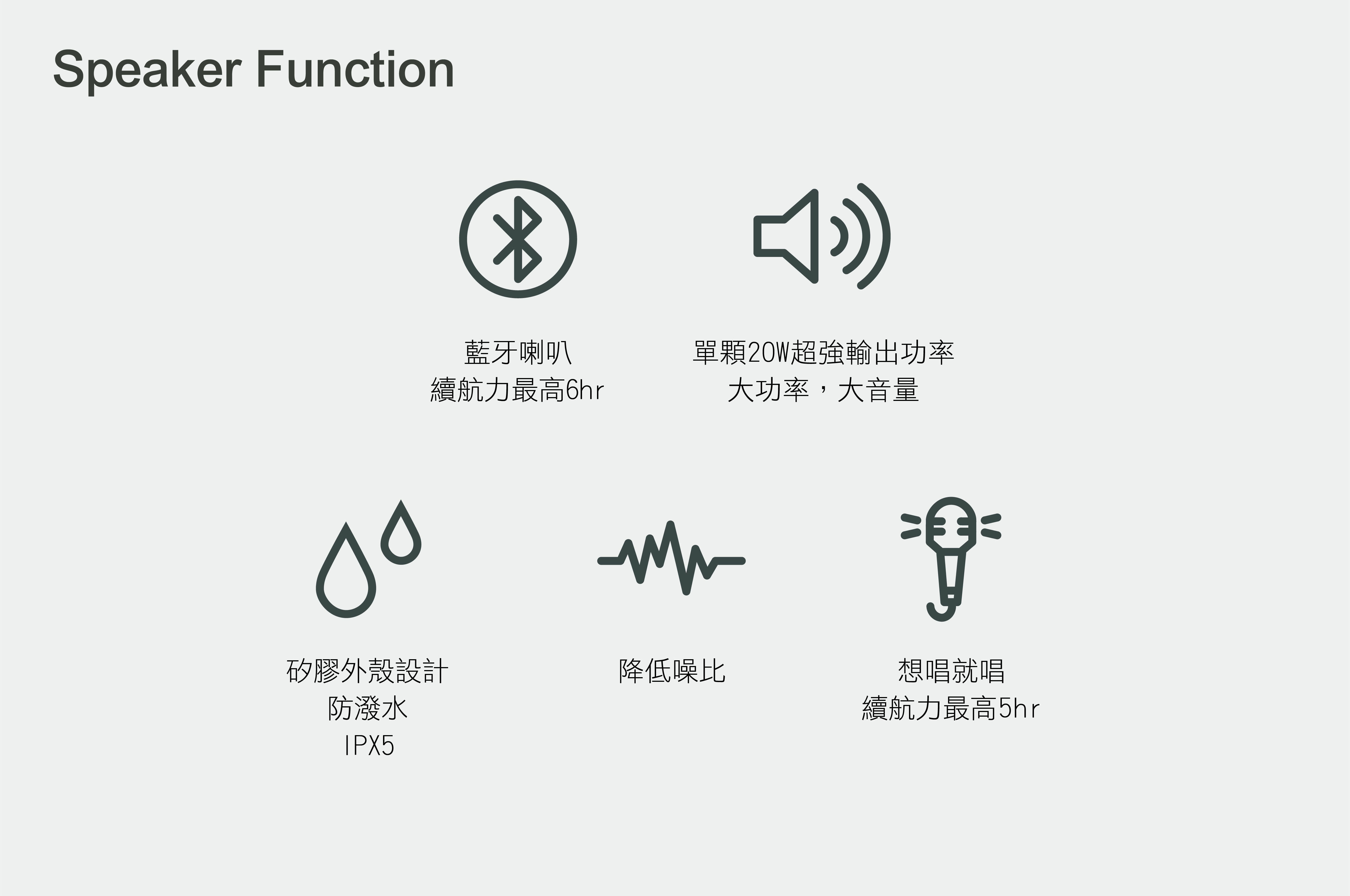 麥克風則為太空彈射艙設計,內置於喇叭內部,打開艙門按壓麥克風頂部即可彈射出艙;兼顧收納及充電功能。7.4V/5000MAH毫安培聚合物高能鋰電池,超長時間續航,讓您的娛樂無極限、輕巧好攜帶。