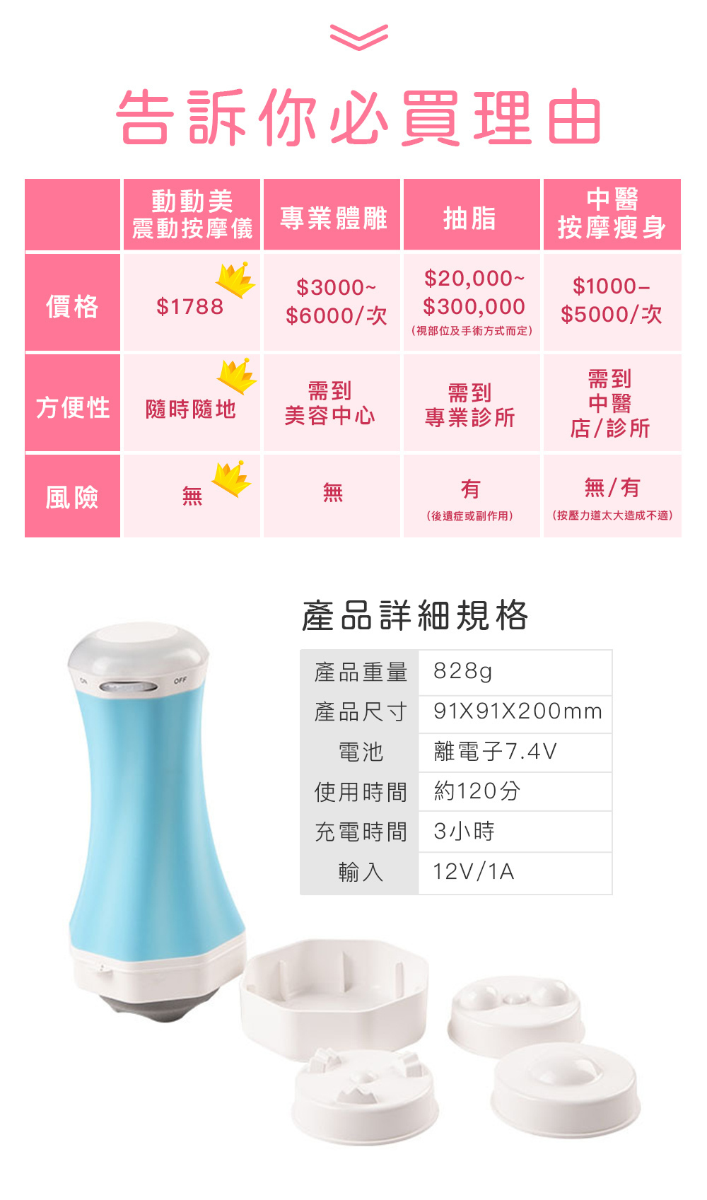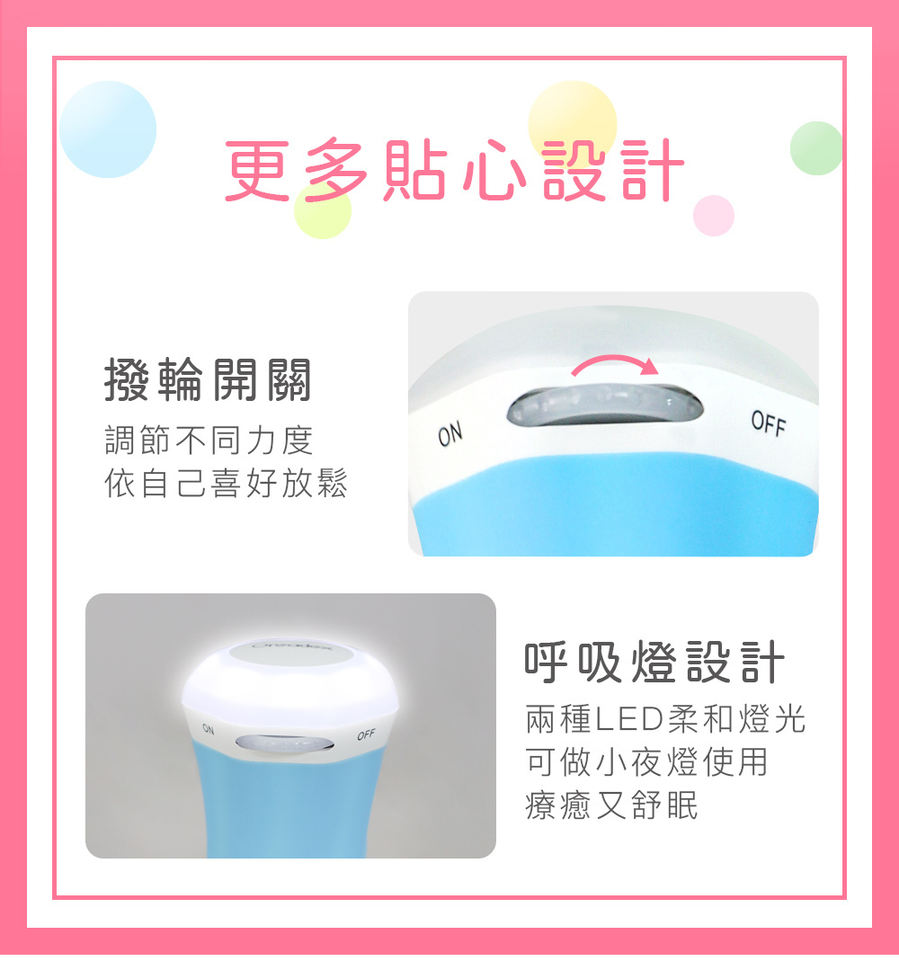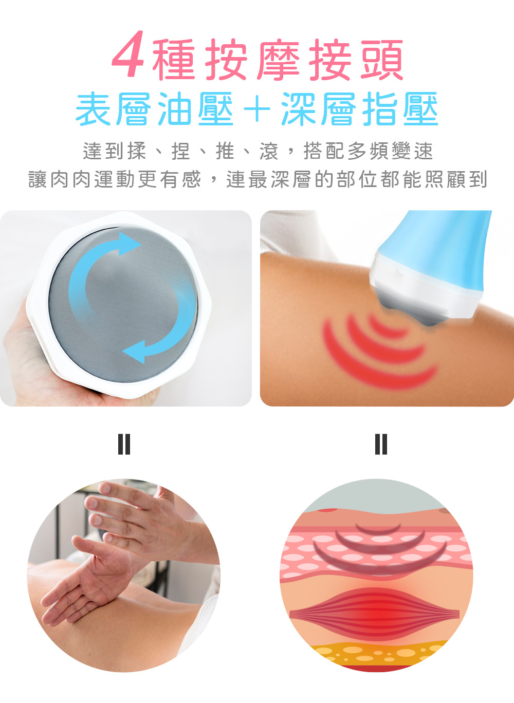 4款按摩頭,可達到真人按摩揉、捏、推、滾的按摩效果