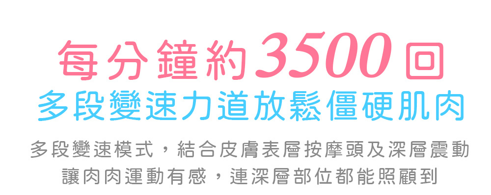 每分鐘約3500轉,波輪開關可多段變速力道可放鬆緊繃肌肉